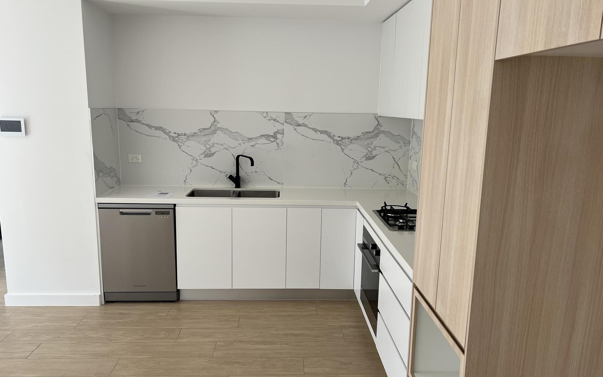 Ultra-modern kitchen with Fisher & Paykel appliances, porcelain marble splashback, and 40mm stone benchtops