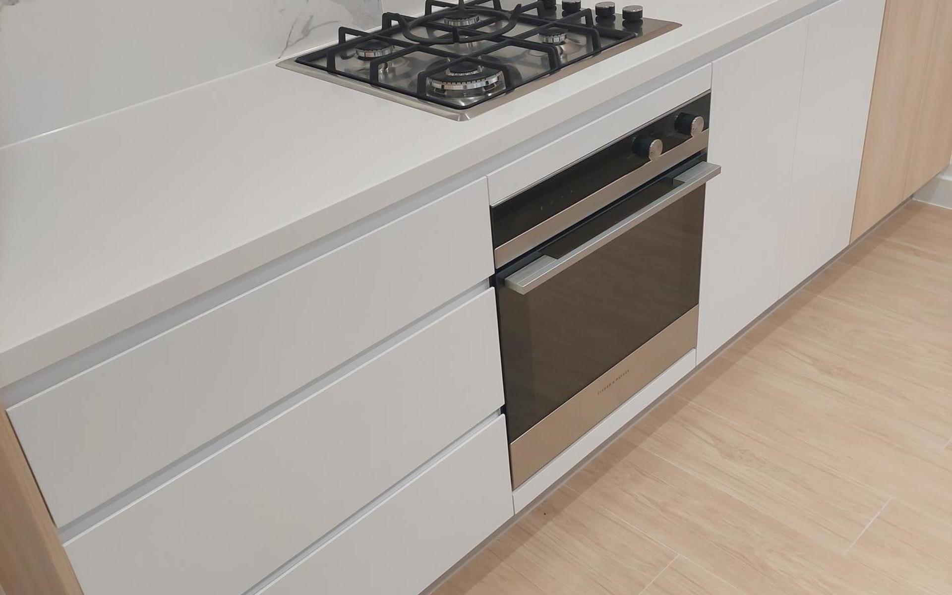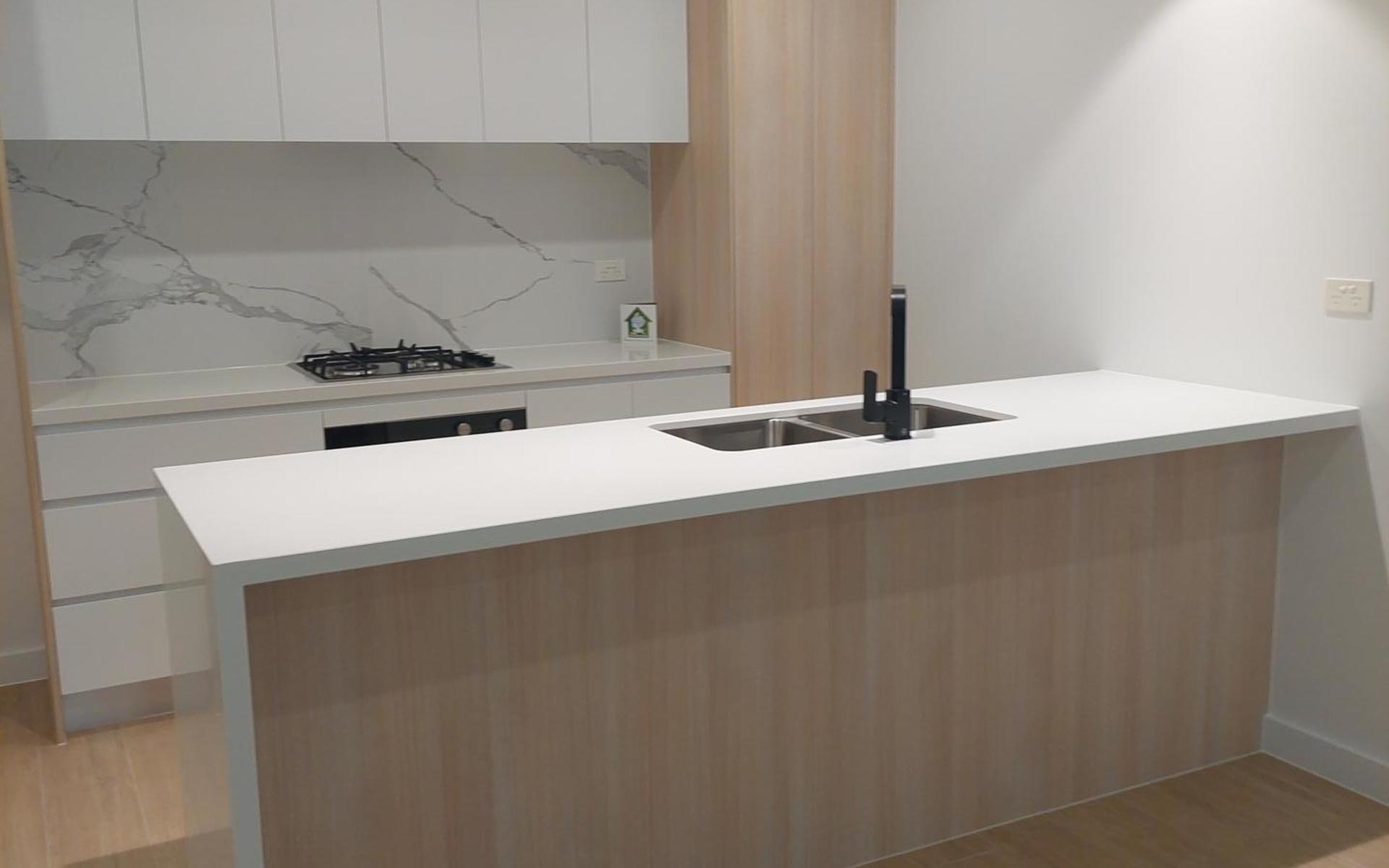 Ultra-modern kitchen with Fisher & Paykel appliances, porcelain marble splashback, and 40mm stone benchtops